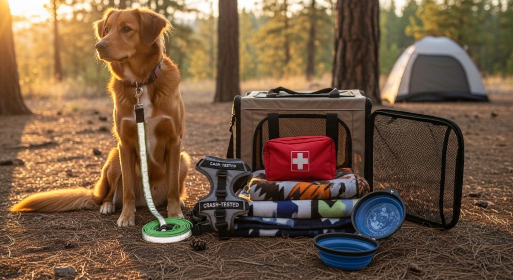 Outdoor adventures often mean heat exposure. Pack a collapsible water bowl, portable water bottle, and cooling mat or vest. These prevent dehydration and overheating — two of the most common travel risks for dogs.