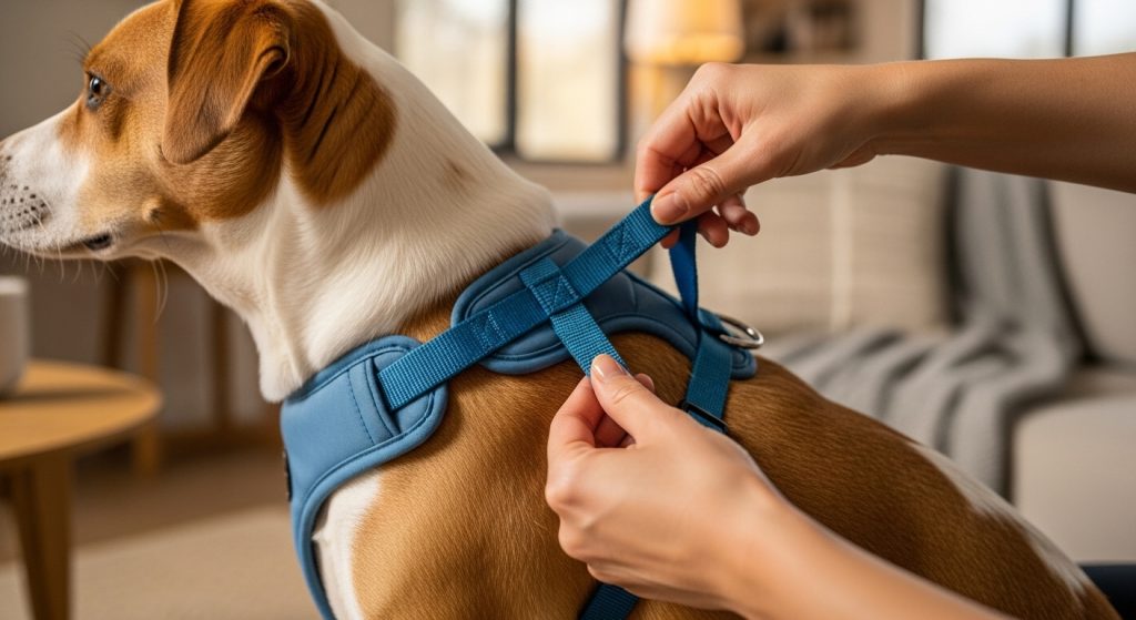 Always test the harness indoors before heading out. Have your dog walk around, check for slipping or pinching, and make adjustments as needed.