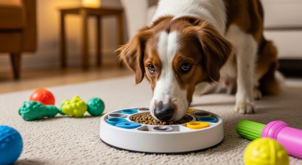 Interactive games like treat puzzles or hide-and-seek stimulate your dog’s problem-solving instincts. They learn cause-and-effect logic — pressing, sniffing, or pawing to get rewards.