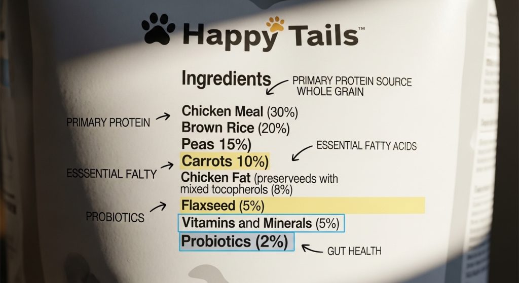 Protein is essential for muscle development and energy. Look for specific animal proteins like chicken, turkey, lamb, salmon, or beef. Avoid vague terms such as “animal by-products” or “meat meal” unless the source is clearly defined.